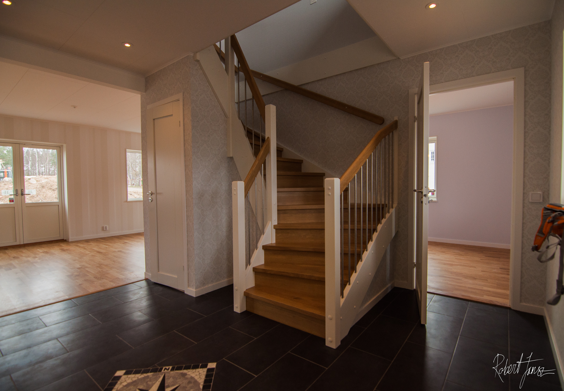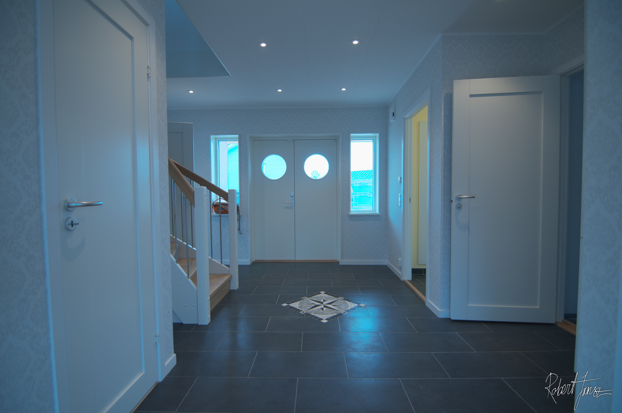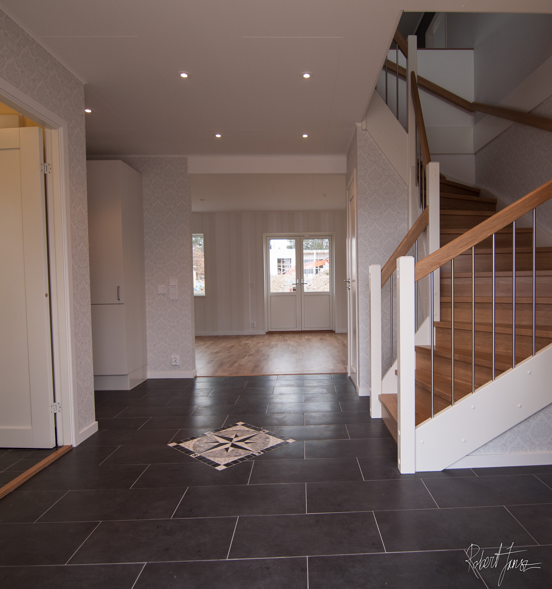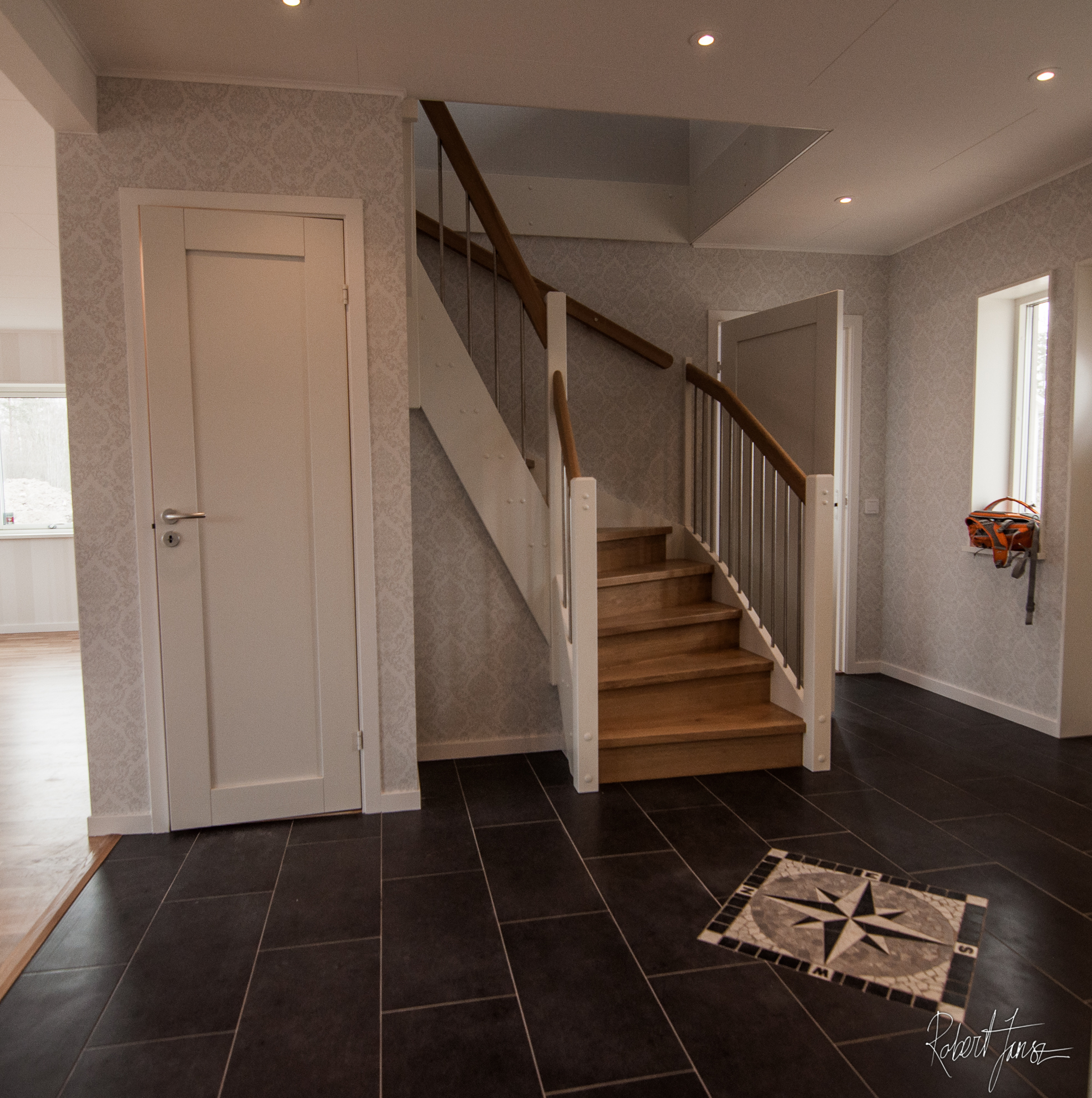 The hall is now finished and all of the different materials matched up really well. The dark clinker floor with the wind rose from konradsson kakel, the borosan easy up 14 wallpaper , the oak staircase and the dimming led light spots.